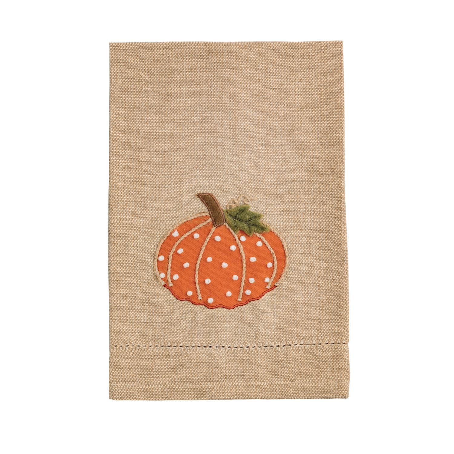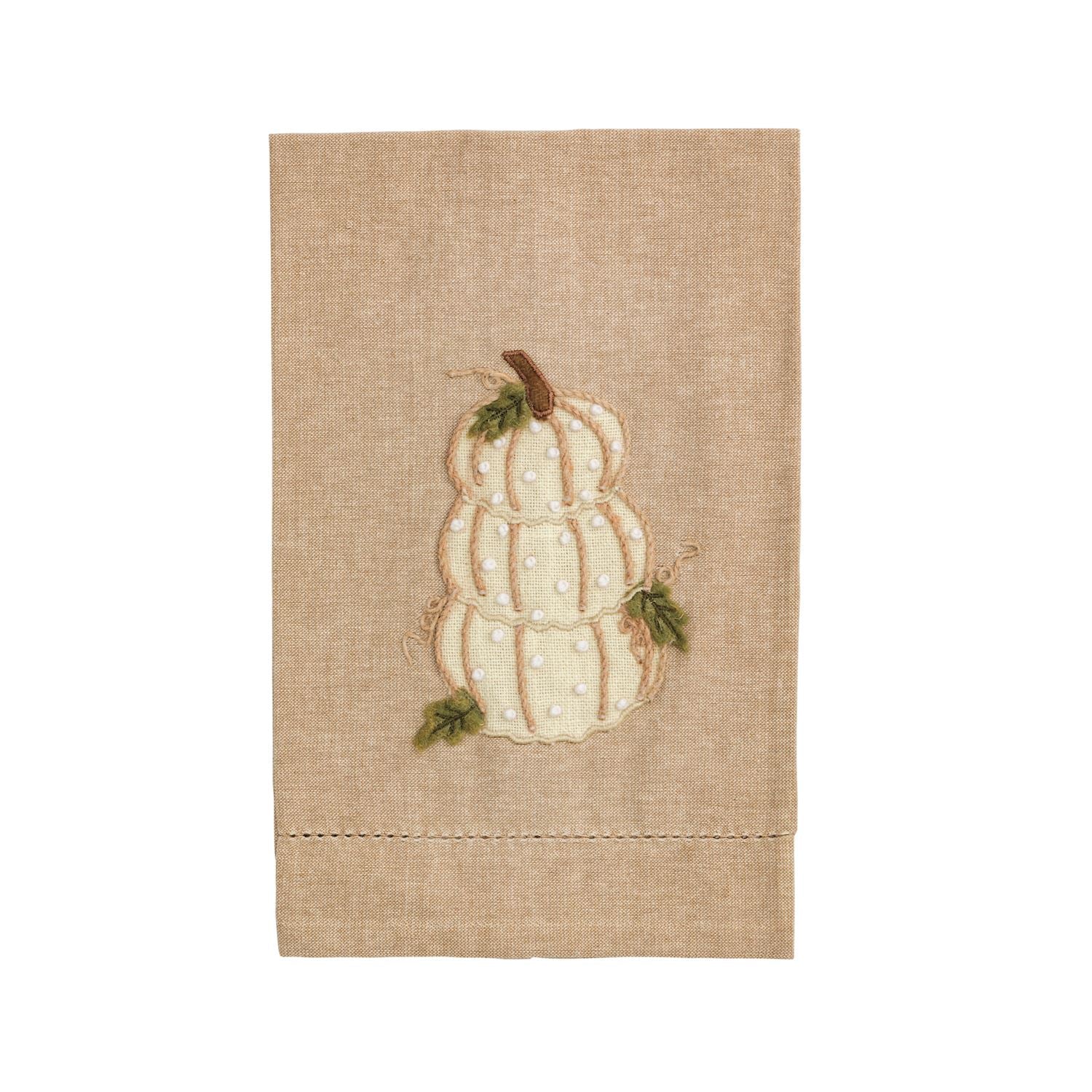 Chambray hand towel features appliqué with French knot detail and hemstitching..
